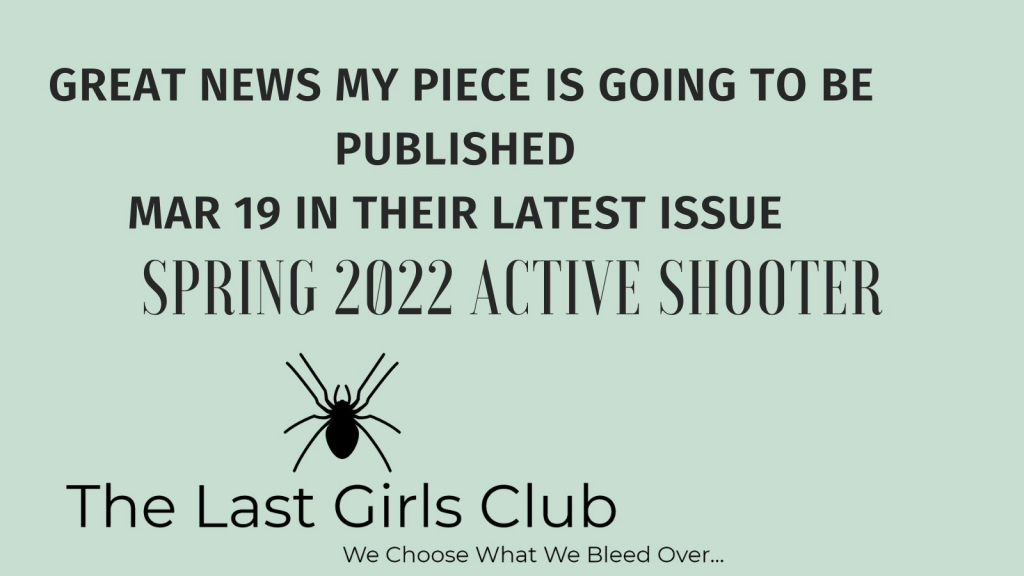 My horror short, “The Snatchers” is set to appear later this month in the Spring 2022 Active Shooter Edition of Last Girls Club. This piece shatters the illusion that virtual violence can be kept separate from real-life violence. It’s a story about our deepest fears of becoming disassociated with reality. I am so excited to share it with you later this month.