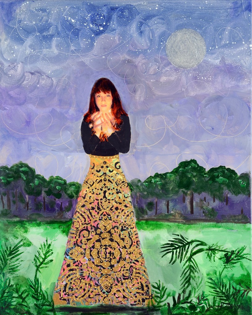 During Spring Break, my daughter and I had a much-needed Artist’s date and visited a local art gallery where we were both drawn to the works of Rosemarie Forsythe. After contacting her about the painting “Magic” she gave me her blessing to write about her piece. Tonight’s full moon before tomorrow’s feast provided the perfect inspiration. I do so hope this poem does her artwork proud.